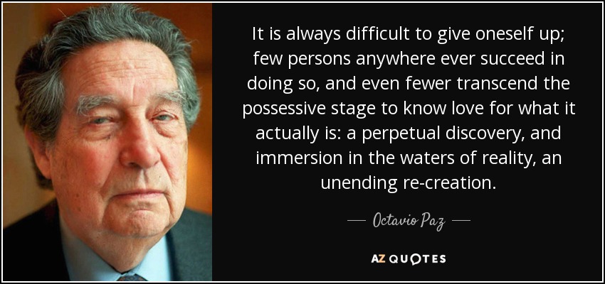 It is always difficult to give oneself up; few persons anywhere ever succeed in doing so, and even fewer transcend the possessive stage to know love for what it actually is: a perpetual discovery, and immersion in the waters of reality, an unending re-creation.