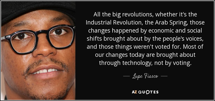 All the big revolutions, whether it's the Industrial Revolution, the Arab Spring, those changes happened by economic and social shifts brought about by the people's voices, and those things weren't voted for. Most of our changes today are brought about through technology, not by voting.