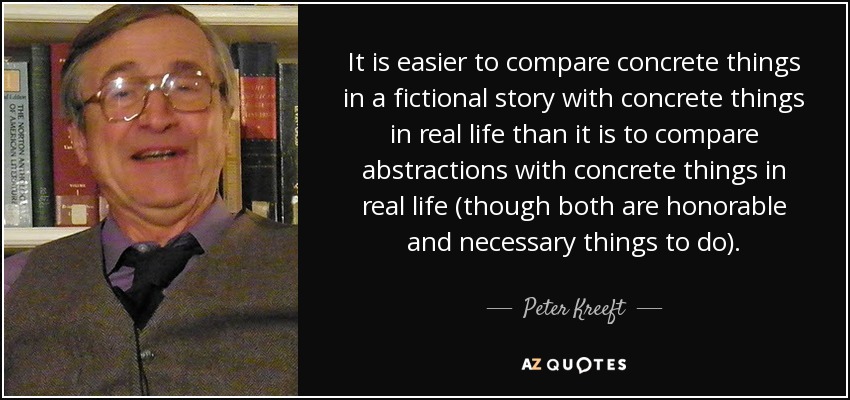 It is easier to compare concrete things in a fictional story with concrete things in real life than it is to compare abstractions with concrete things in real life (though both are honorable and necessary things to do).