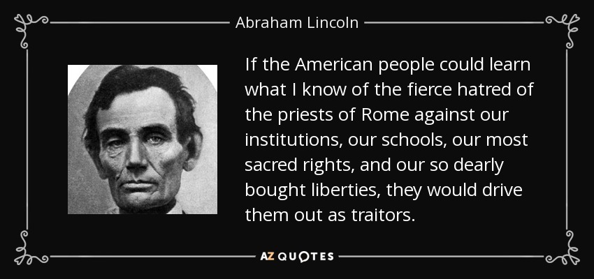 If the American people could learn what I know of the fierce hatred of the priests of Rome against our institutions, our schools, our most sacred rights, and our so dearly bought liberties, they would drive them out as traitors.