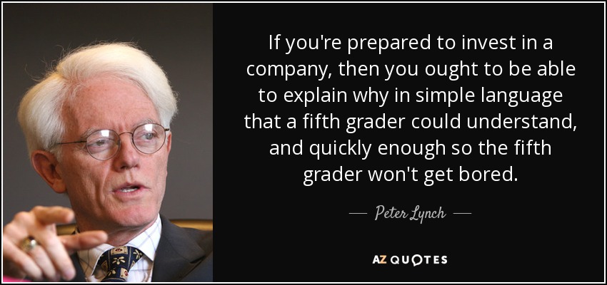 If you're prepared to invest in a company, then you ought to be able to explain why in simple language that a fifth grader could understand, and quickly enough so the fifth grader won't get bored.