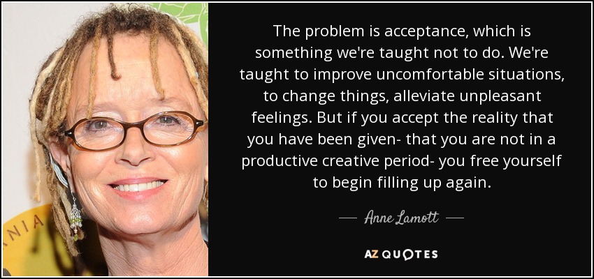 The problem is acceptance, which is something we're taught not to do. We're taught to improve uncomfortable situations, to change things, alleviate unpleasant feelings. But if you accept the reality that you have been given- that you are not in a productive creative period- you free yourself to begin filling up again.