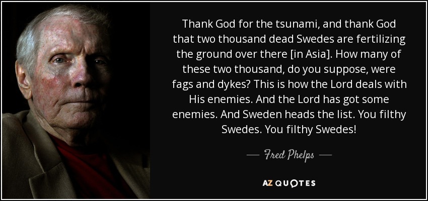 Thank God for the tsunami, and thank God that two thousand dead Swedes are fertilizing the ground over there [in Asia]. How many of these two thousand, do you suppose, were fags and dykes? This is how the Lord deals with His enemies. And the Lord has got some enemies. And Sweden heads the list. You filthy Swedes. You filthy Swedes!