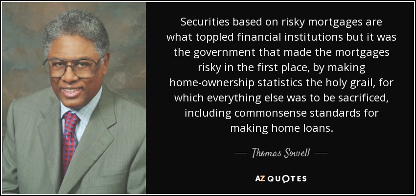 Securities based on risky mortgages are what toppled financial institutions but it was the government that made the mortgages risky in the first place, by making home-ownership statistics the holy grail, for which everything else was to be sacrificed, including commonsense standards for making home loans.