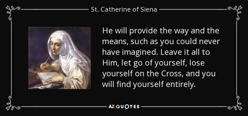He will provide the way and the means, such as you could never have imagined. Leave it all to Him, let go of yourself, lose yourself on the Cross, and you will find yourself entirely.