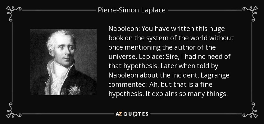 Napoleon: You have written this huge book on the system of the world without once mentioning the author of the universe. Laplace: Sire, I had no need of that hypothesis. Later when told by Napoleon about the incident, Lagrange commented: Ah, but that is a fine hypothesis. It explains so many things.