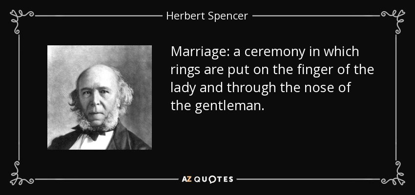 Marriage: a ceremony in which rings are put on the finger of the lady and through the nose of the gentleman.