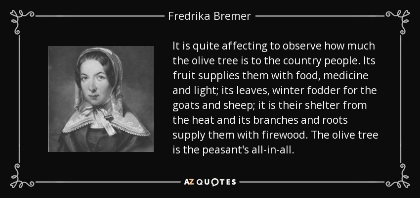 It is quite affecting to observe how much the olive tree is to the country people. Its fruit supplies them with food, medicine and light; its leaves, winter fodder for the goats and sheep; it is their shelter from the heat and its branches and roots supply them with firewood. The olive tree is the peasant's all-in-all.