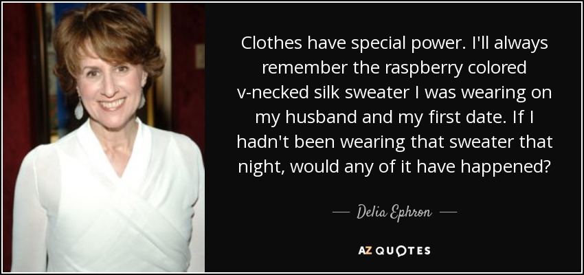Clothes have special power. I'll always remember the raspberry colored v-necked silk sweater I was wearing on my husband and my first date. If I hadn't been wearing that sweater that night, would any of it have happened?
