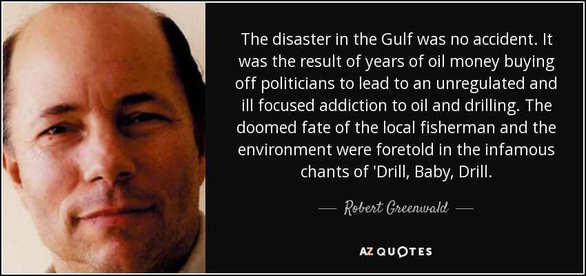 The disaster in the Gulf was no accident. It was the result of years of oil money buying off politicians to lead to an unregulated and ill focused addiction to oil and drilling. The doomed fate of the local fisherman and the environment were foretold in the infamous chants of 'Drill, Baby, Drill.