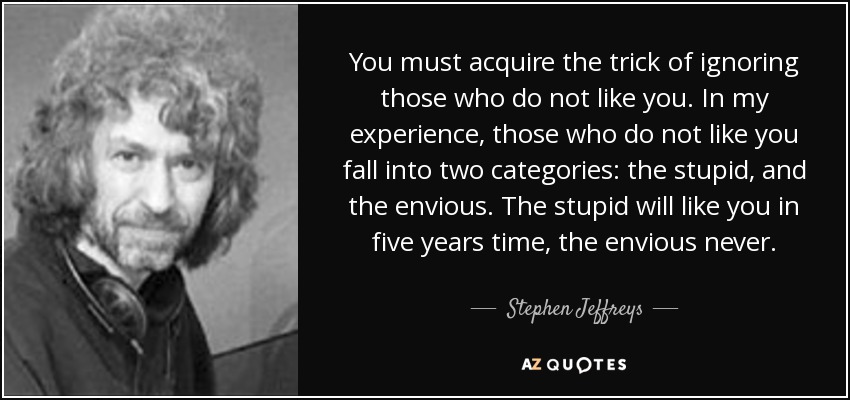 You must acquire the trick of ignoring those who do not like you. In my experience, those who do not like you fall into two categories: the stupid, and the envious. The stupid will like you in five years time, the envious never.