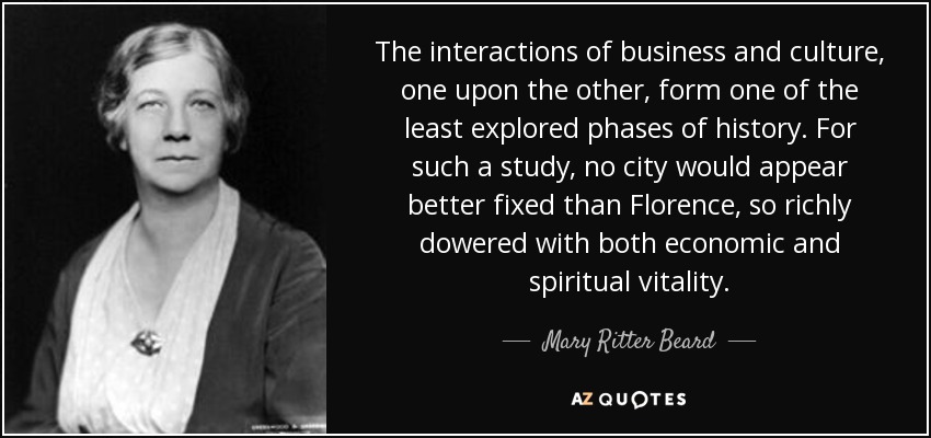 The interactions of business and culture, one upon the other, form one of the least explored phases of history. For such a study, no city would appear better fixed than Florence, so richly dowered with both economic and spiritual vitality.