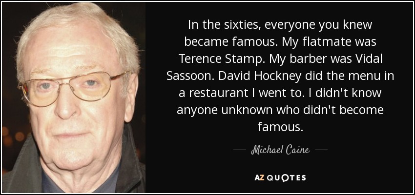 In the sixties, everyone you knew became famous. My flatmate was Terence Stamp. My barber was Vidal Sassoon. David Hockney did the menu in a restaurant I went to. I didn't know anyone unknown who didn't become famous.