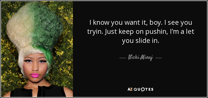I know you want it, boy. I see you tryin. Just keep on pushin, I'm a let you slide in.
