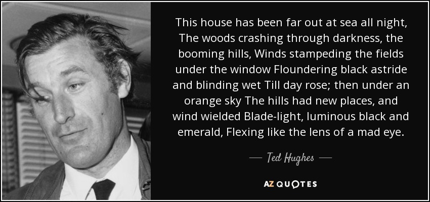 This house has been far out at sea all night, The woods crashing through darkness, the booming hills, Winds stampeding the fields under the window Floundering black astride and blinding wet Till day rose; then under an orange sky The hills had new places, and wind wielded Blade-light, luminous black and emerald, Flexing like the lens of a mad eye.