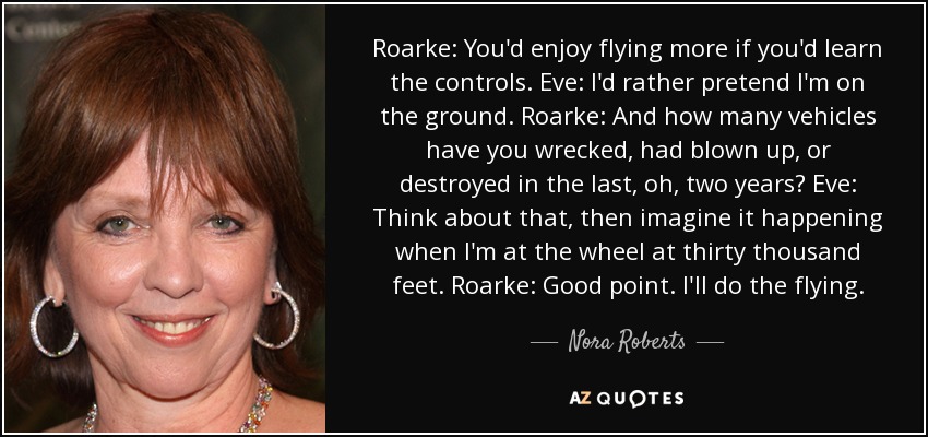 Roarke: You'd enjoy flying more if you'd learn the controls. Eve: I'd rather pretend I'm on the ground. Roarke: And how many vehicles have you wrecked, had blown up, or destroyed in the last, oh, two years? Eve: Think about that, then imagine it happening when I'm at the wheel at thirty thousand feet. Roarke: Good point. I'll do the flying.