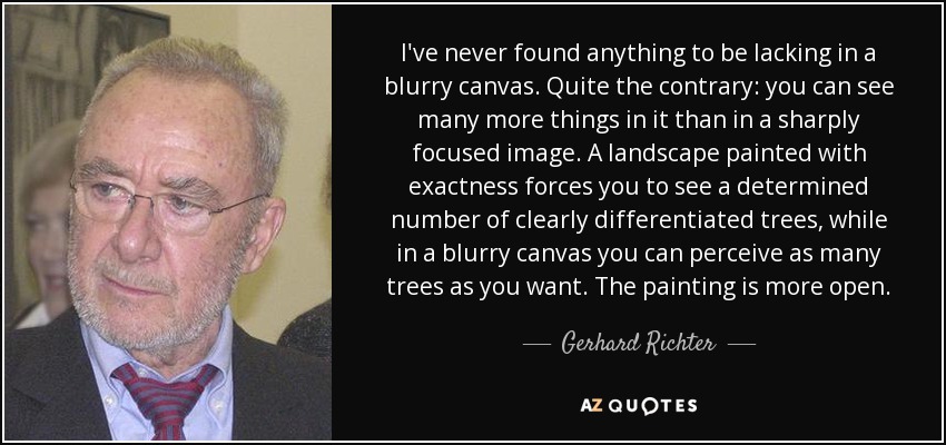 I've never found anything to be lacking in a blurry canvas. Quite the contrary: you can see many more things in it than in a sharply focused image. A landscape painted with exactness forces you to see a determined number of clearly differentiated trees, while in a blurry canvas you can perceive as many trees as you want. The painting is more open.