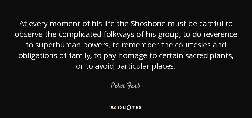 At every moment of his life the Shoshone must be careful to observe the complicated folkways of his group, to do reverence to superhuman powers, to remember the courtesies and obligations of family, to pay homage to certain sacred plants, or to avoid particular places.