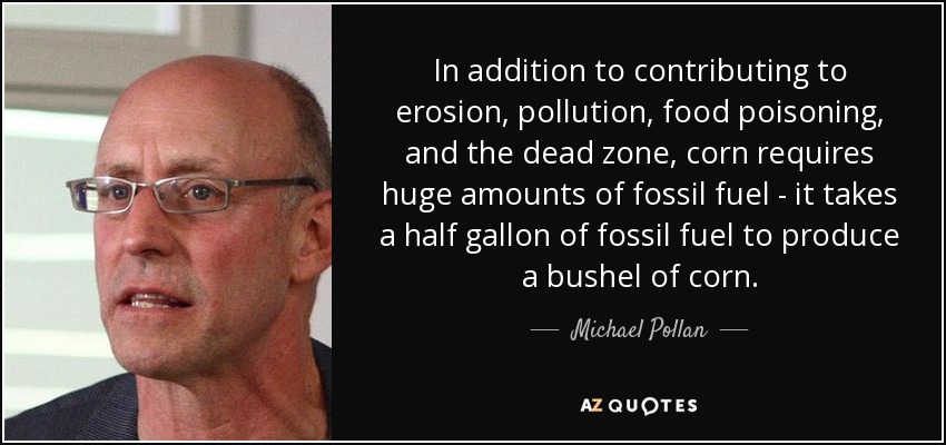 In addition to contributing to erosion, pollution, food poisoning, and the dead zone, corn requires huge amounts of fossil fuel - it takes a half gallon of fossil fuel to produce a bushel of corn.