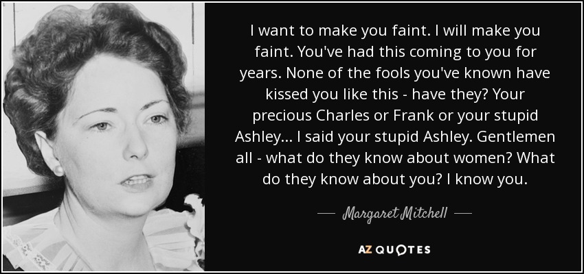 I want to make you faint. I will make you faint. You've had this coming to you for years. None of the fools you've known have kissed you like this - have they? Your precious Charles or Frank or your stupid Ashley... I said your stupid Ashley. Gentlemen all - what do they know about women? What do they know about you? I know you.
