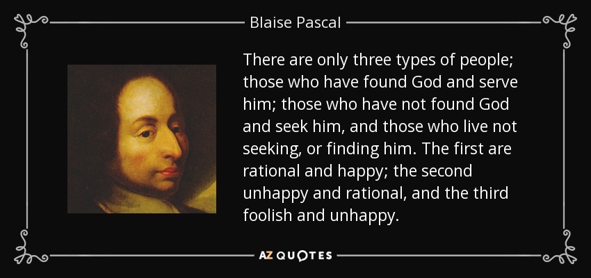 There are only three types of people; those who have found God and serve him; those who have not found God and seek him, and those who live not seeking, or finding him. The first are rational and happy; the second unhappy and rational, and the third foolish and unhappy.