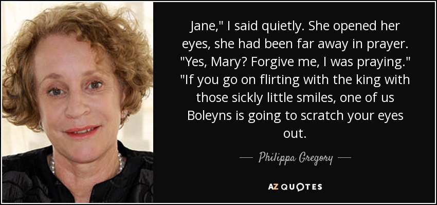 Jane," I said quietly. She opened her eyes, she had been far away in prayer. "Yes, Mary? Forgive me, I was praying." "If you go on flirting with the king with those sickly little smiles, one of us Boleyns is going to scratch your eyes out.