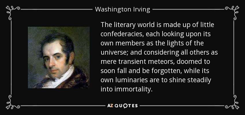 The literary world is made up of little confederacies, each looking upon its own members as the lights of the universe; and considering all others as mere transient meteors, doomed to soon fall and be forgotten, while its own luminaries are to shine steadily into immortality.
