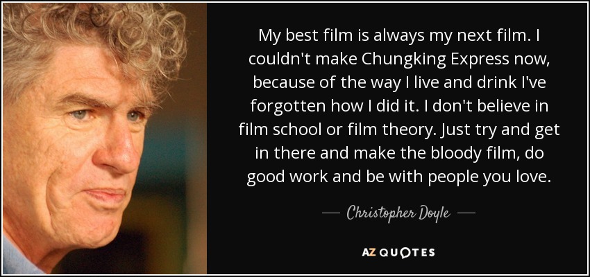 My best film is always my next film. I couldn't make Chungking Express now, because of the way I live and drink I've forgotten how I did it. I don't believe in film school or film theory. Just try and get in there and make the bloody film, do good work and be with people you love.