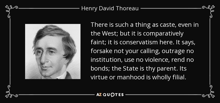 There is such a thing as caste, even in the West; but it is comparatively faint; it is conservatism here. It says, forsake not your calling, outrage no institution, use no violence, rend no bonds; the State is thy parent. Its virtue or manhood is wholly filial.