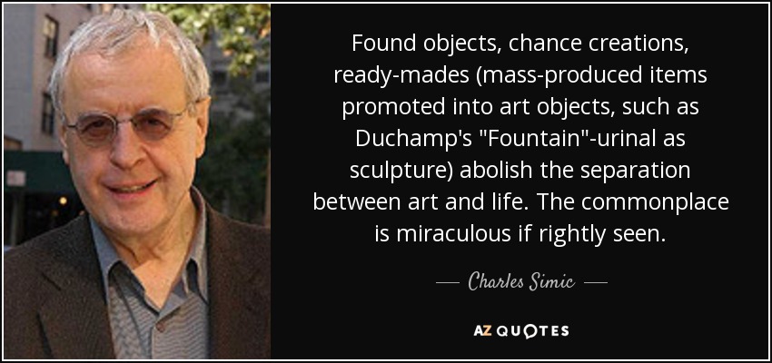 Found objects, chance creations, ready-mades (mass-produced items promoted into art objects, such as Duchamp's "Fountain"-urinal as sculpture) abolish the separation between art and life. The commonplace is miraculous if rightly seen.