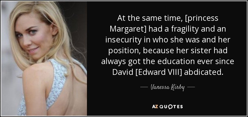 At the same time, [princess Margaret] had a fragility and an insecurity in who she was and her position, because her sister had always got the education ever since David [Edward VIII] abdicated.