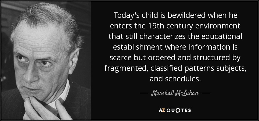 Today's child is bewildered when he enters the 19th century environment that still characterizes the educational establishment where information is scarce but ordered and structured by fragmented, classified patterns subjects, and schedules.
