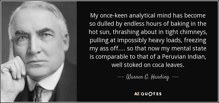 My once-keen analytical mind has become so dulled by endless hours of baking in the hot sun, thrashing about in tight chimneys, pulling at impossibly heavy loads, freezing my ass off.... so that now my mental state is comparable to that of a Peruvian Indian, well stoked on coca leaves.