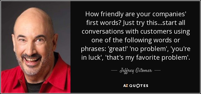 How friendly are your companies' first words? Just try this...start all conversations with customers using one of the following words or phrases: 'great!' 'no problem', 'you're in luck', 'that's my favorite problem'.