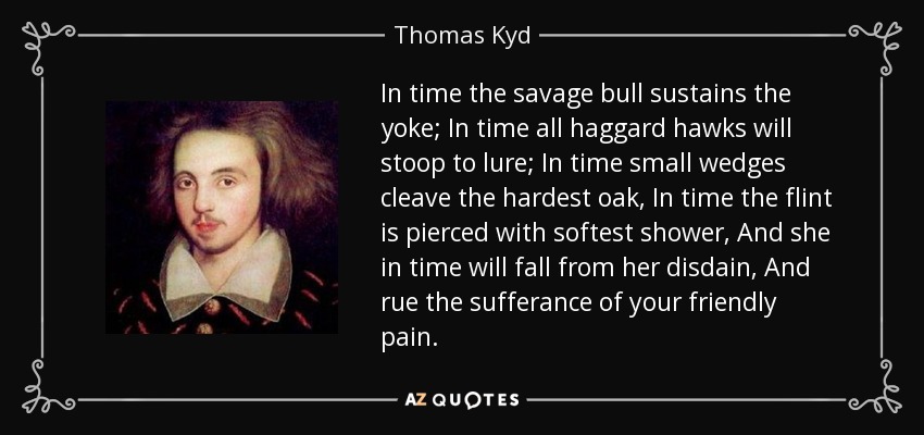 In time the savage bull sustains the yoke; In time all haggard hawks will stoop to lure; In time small wedges cleave the hardest oak, In time the flint is pierced with softest shower, And she in time will fall from her disdain, And rue the sufferance of your friendly pain.