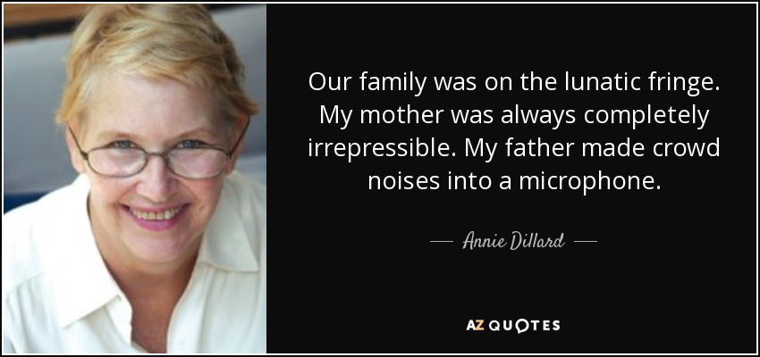 Our family was on the lunatic fringe. My mother was always completely irrepressible. My father made crowd noises into a microphone.