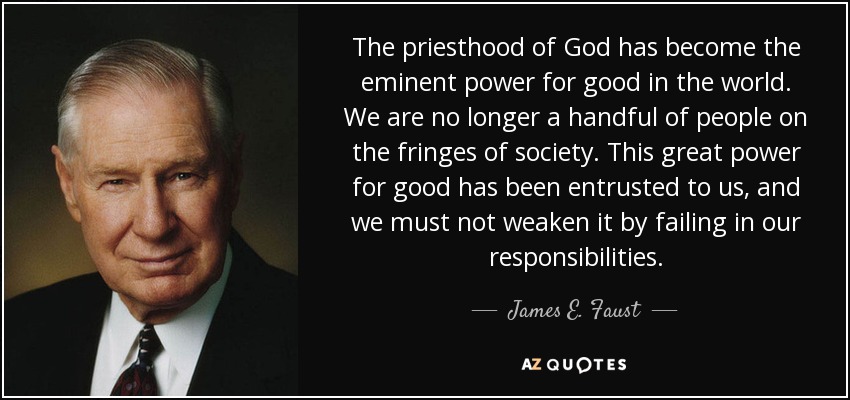 The priesthood of God has become the eminent power for good in the world. We are no longer a handful of people on the fringes of society. This great power for good has been entrusted to us, and we must not weaken it by failing in our responsibilities.