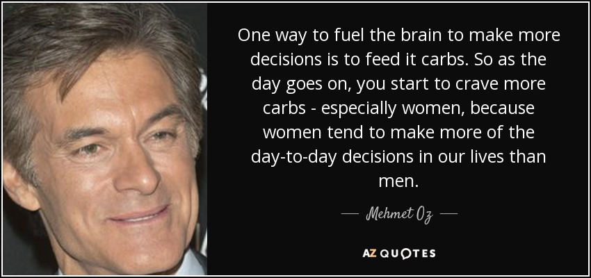 One way to fuel the brain to make more decisions is to feed it carbs. So as the day goes on, you start to crave more carbs - especially women, because women tend to make more of the day-to-day decisions in our lives than men.