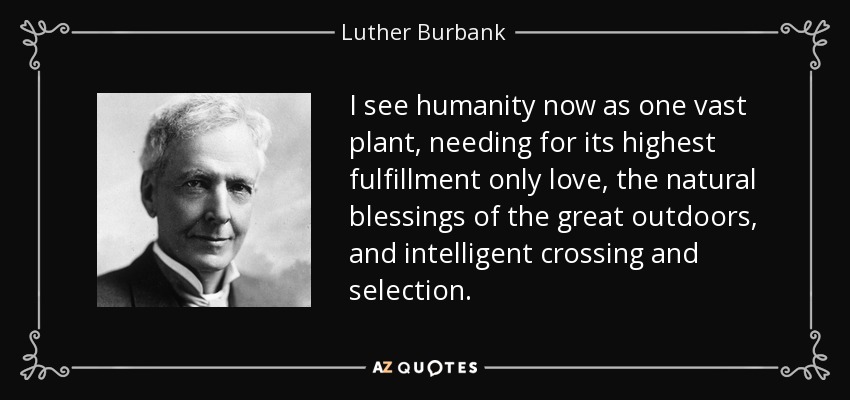 I see humanity now as one vast plant, needing for its highest fulfillment only love, the natural blessings of the great outdoors, and intelligent crossing and selection.