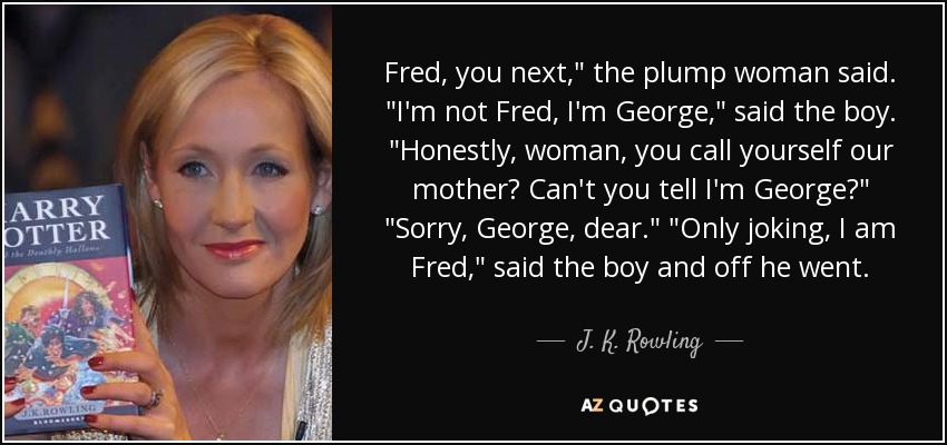Fred, you next," the plump woman said. "I'm not Fred, I'm George," said the boy. "Honestly, woman, you call yourself our mother? Can't you tell I'm George?" "Sorry, George, dear." "Only joking, I am Fred," said the boy and off he went.
