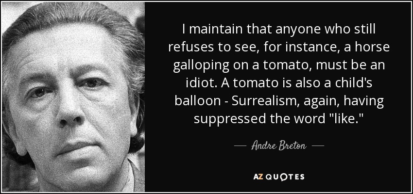 I maintain that anyone who still refuses to see, for instance, a horse galloping on a tomato, must be an idiot. A tomato is also a child's balloon - Surrealism, again, having suppressed the word "like."