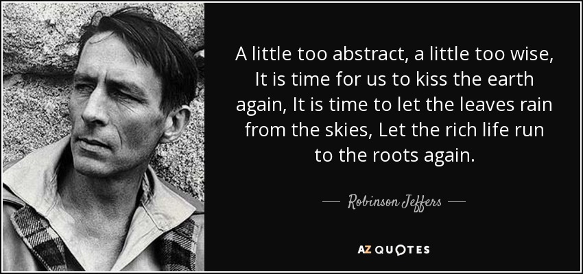 A little too abstract, a little too wise, It is time for us to kiss the earth again, It is time to let the leaves rain from the skies, Let the rich life run to the roots again.