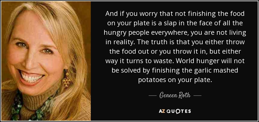 And if you worry that not finishing the food on your plate is a slap in the face of all the hungry people everywhere, you are not living in reality. The truth is that you either throw the food out or you throw it in, but either way it turns to waste. World hunger will not be solved by finishing the garlic mashed potatoes on your plate.