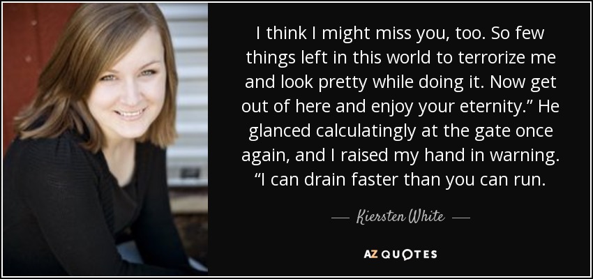 I think I might miss you, too. So few things left in this world to terrorize me and look pretty while doing it. Now get out of here and enjoy your eternity.” He glanced calculatingly at the gate once again, and I raised my hand in warning. “I can drain faster than you can run.