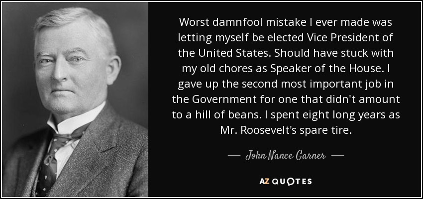 Worst damnfool mistake I ever made was letting myself be elected Vice President of the United States. Should have stuck with my old chores as Speaker of the House. I gave up the second most important job in the Government for one that didn't amount to a hill of beans. I spent eight long years as Mr. Roosevelt's spare tire.