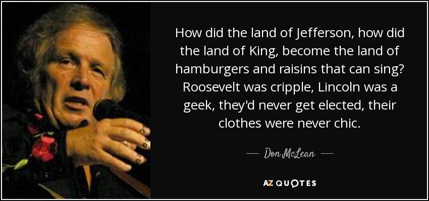 How did the land of Jefferson, how did the land of King, become the land of hamburgers and raisins that can sing? Roosevelt was cripple, Lincoln was a geek, they'd never get elected, their clothes were never chic.