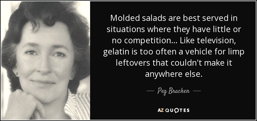 Molded salads are best served in situations where they have little or no competition ... Like television, gelatin is too often a vehicle for limp leftovers that couldn't make it anywhere else.