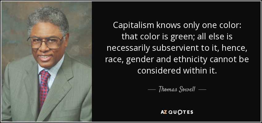 Capitalism knows only one color: that color is green; all else is necessarily subservient to it, hence, race, gender and ethnicity cannot be considered within it.
