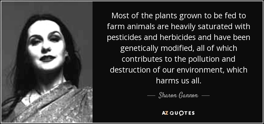 Most of the plants grown to be fed to farm animals are heavily saturated with pesticides and herbicides and have been genetically modified, all of which contributes to the pollution and destruction of our environment, which harms us all.