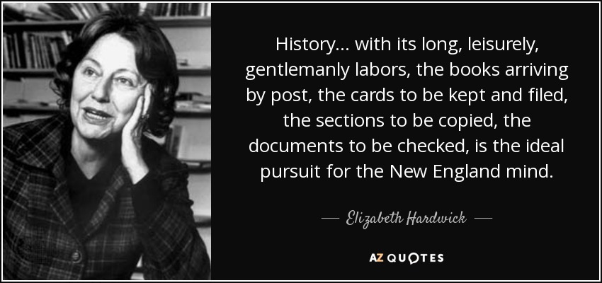 History ... with its long, leisurely, gentlemanly labors, the books arriving by post, the cards to be kept and filed, the sections to be copied, the documents to be checked, is the ideal pursuit for the New England mind.